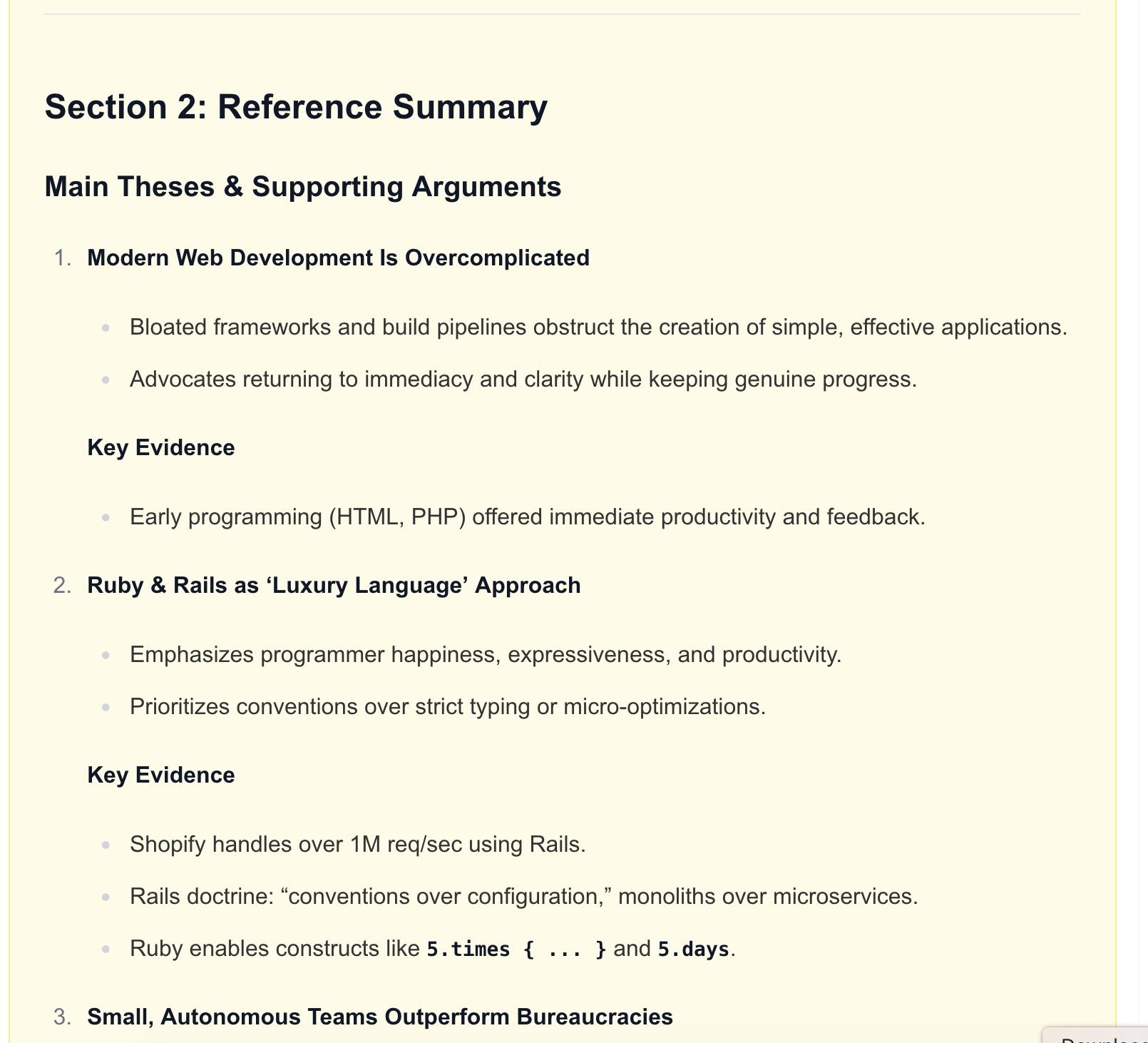 Future improvements will be around managing the context the LLM gets. Right now, I’m giving it all the theses and arguments found along the way. I’m probably going to have another processing step of cleaning that list up, deduplicating it, removing things that might not be as relevant, etc.
