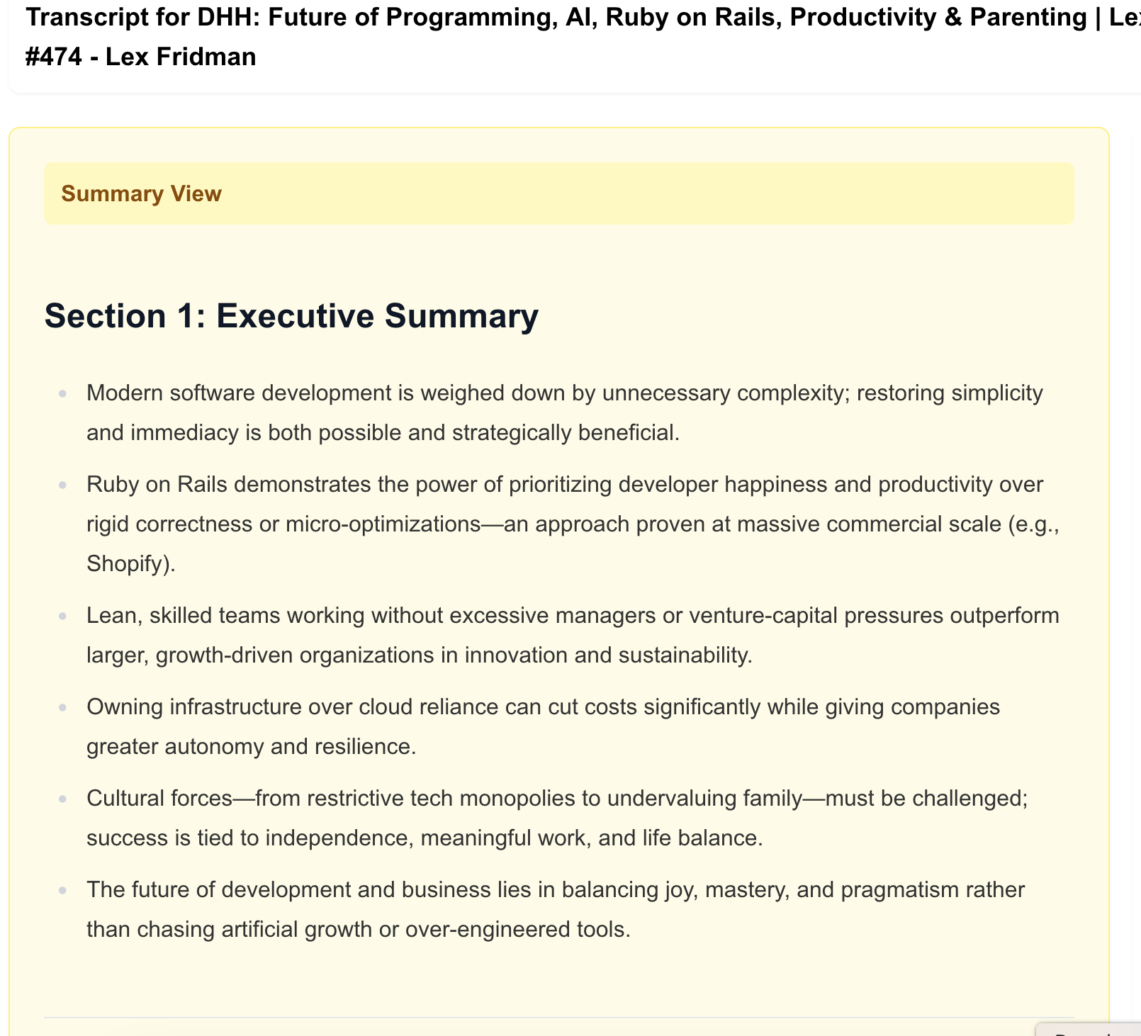 This I think is good, useful for me as a human. For shorter articles, the benefit isn’t obvious but with really long content (like that five‑hour podcast), the payoff is clear