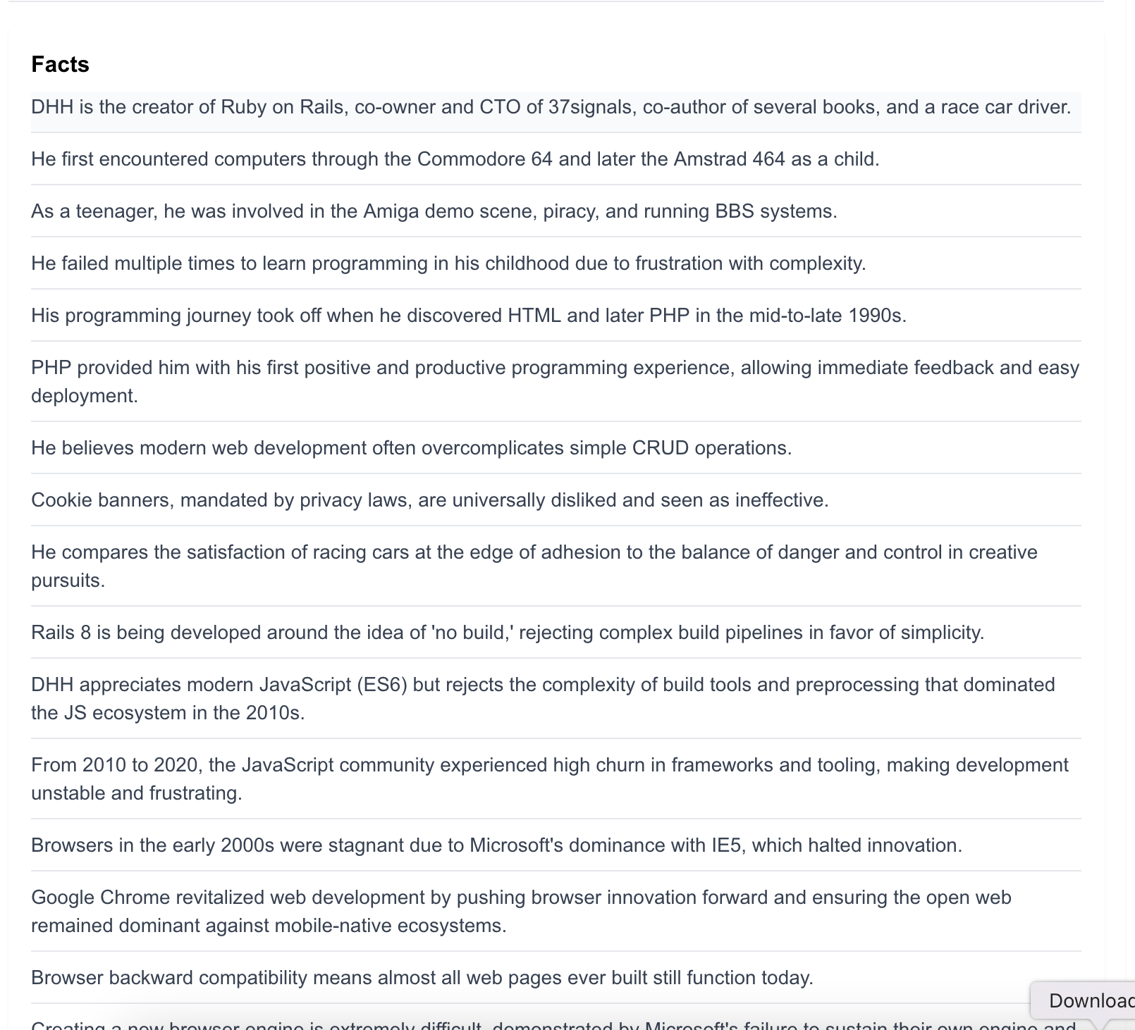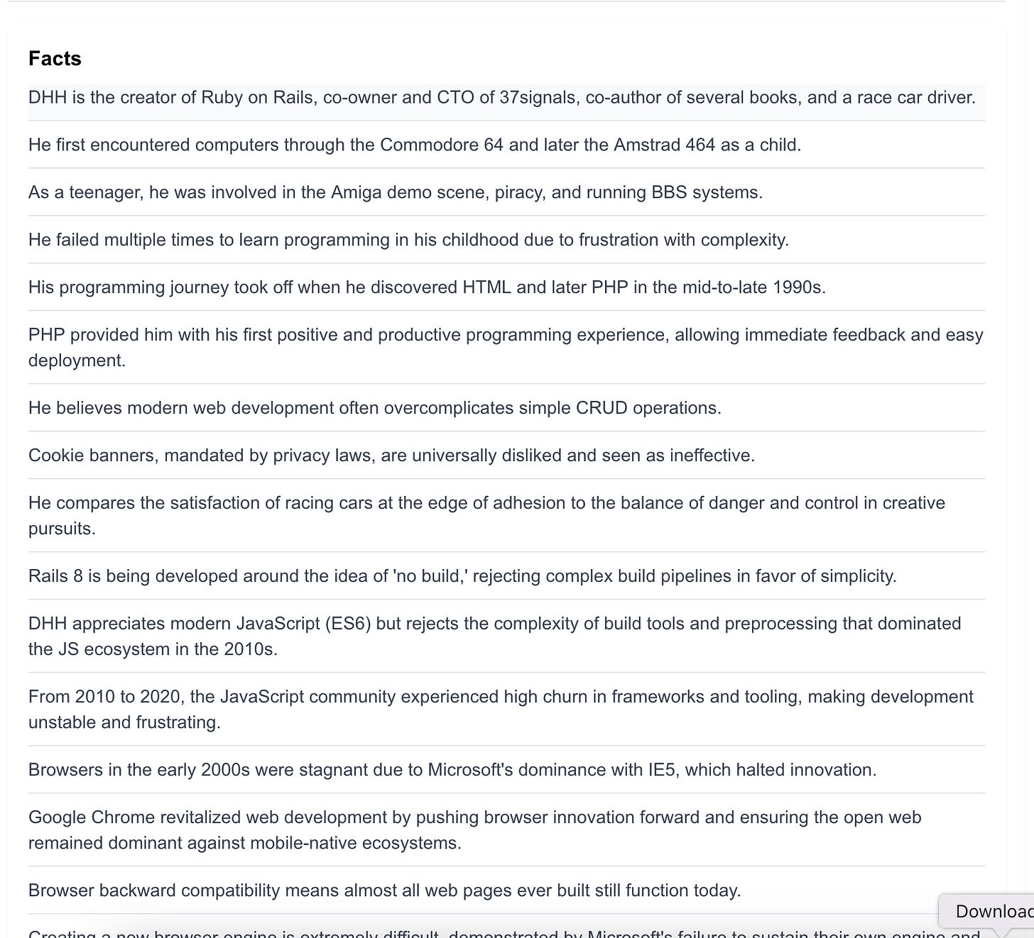 One thing you might notice in the list of facts is that a number of those facts are only relevant in the context of other facts and the article. For example, “He believes modern web development often overcomplicates simple CRUD operations”. Who is ‘he’? This isn’t quite the discrete fact I wanted, I will need to play with this to come up with a better way.